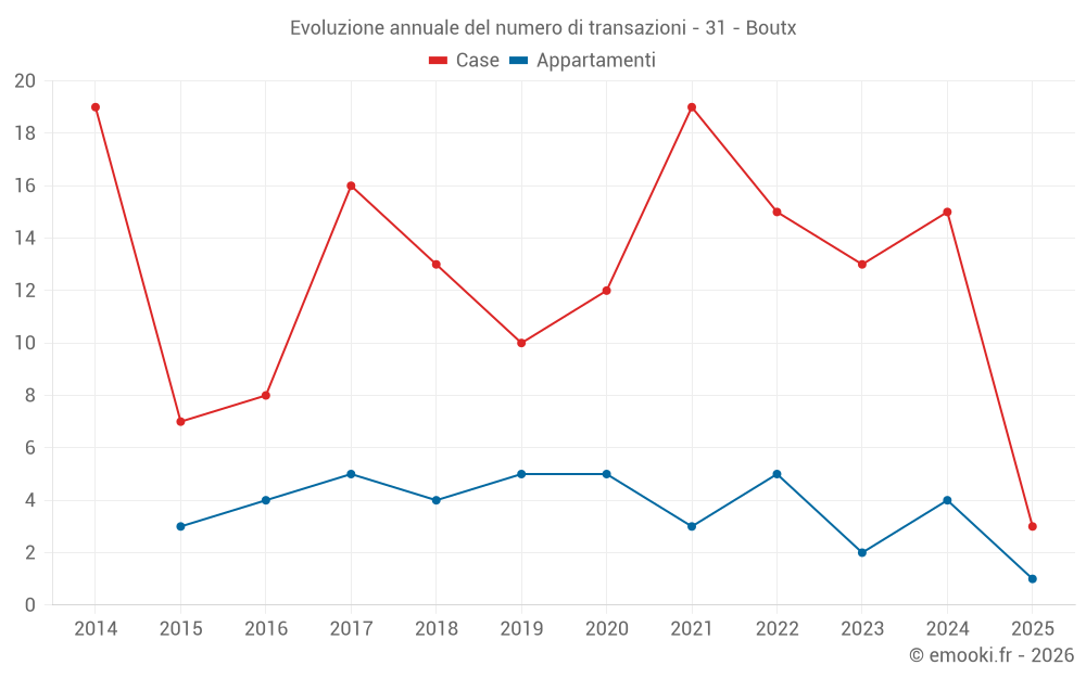 Il prezzo mediano sulle 22 transazioni di case degli ultimi 24 mesi nel comune di Boutx era di 1 258 € al metro quadrato per un valore patrimoniale mediano di 96 250 €. In questo periodo il 60% delle transazioni era tra 576 e 1 700 € al metro quadrato (dal 2° all'8° decile).
