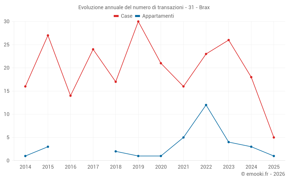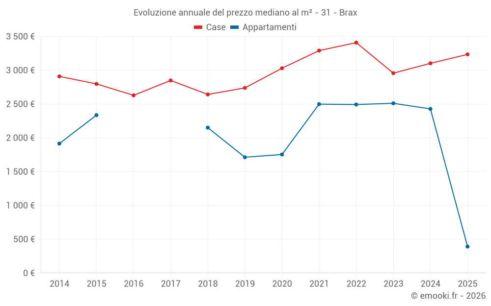 Il prezzo mediano sulle 18 transazioni di case degli ultimi 12 mesi nel comune di Brax era di 3 127 € al metro quadrato per un valore patrimoniale mediano di 298 275 €. In questo periodo il 60% delle transazioni era tra 2 856 e 3 751 € al metro quadrato (dal 2° all'8° decile).
