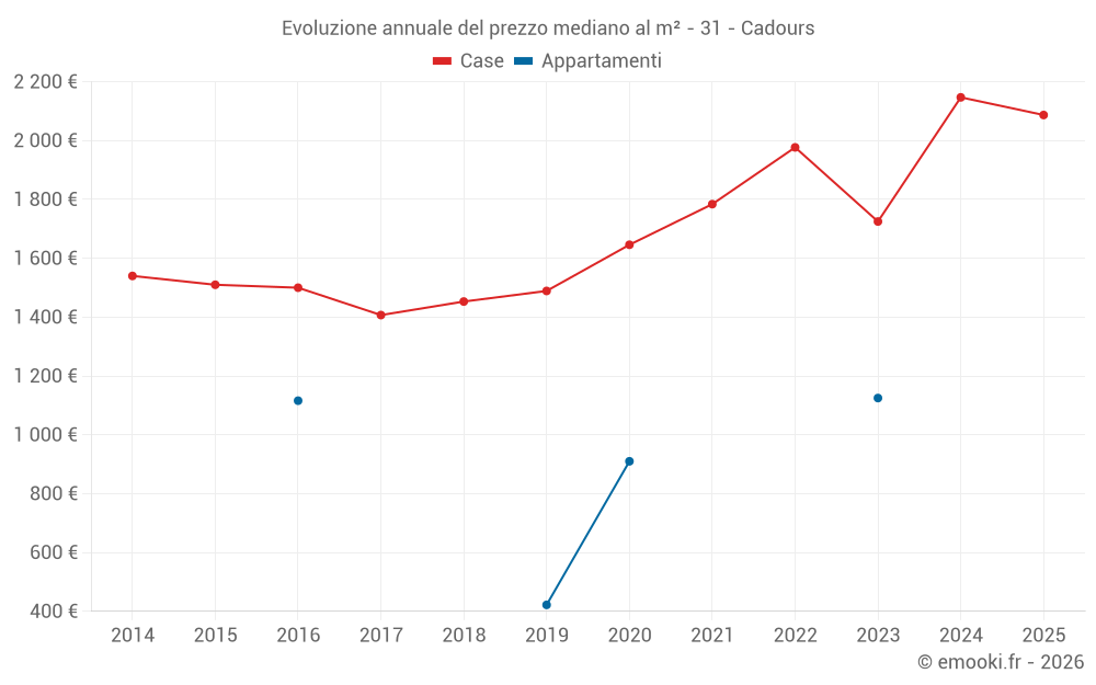 Il prezzo mediano sulle 18 transazioni di case degli ultimi 24 mesi nel comune di Cadours era di 2 088 € al metro quadrato per un valore patrimoniale mediano di 183 505 €. In questo periodo il 60% delle transazioni era tra 1 363 e 2 339 € al metro quadrato (dal 2° all'8° decile).