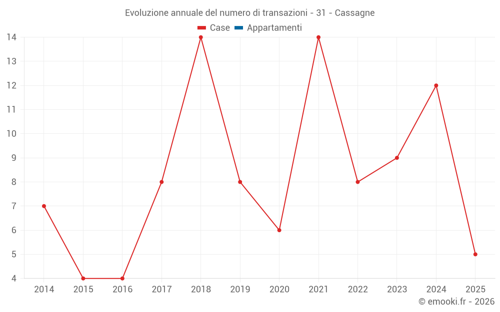 Il prezzo mediano sulle 21 transazioni di case degli ultimi 24 mesi nel comune di Cassagne era di 1 444 € al metro quadrato per un valore patrimoniale mediano di 130 000 €. In questo periodo il 60% delle transazioni era tra 932 e 1 772 € al metro quadrato (dal 2° all'8° decile).