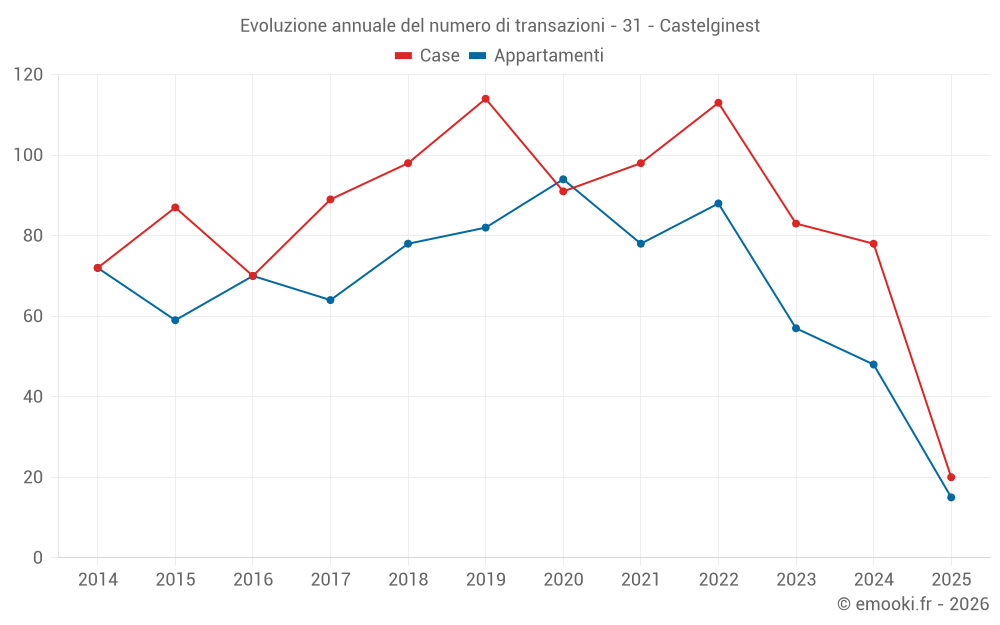 Il prezzo mediano sulle 20 transazioni di case degli ultimi 6 mesi nel comune di Castelginest era di 2 980 € al metro quadrato per un valore patrimoniale mediano di 266 000 €. In questo periodo il 60% delle transazioni era tra 1 754 e 3 312 € al metro quadrato (dal 2° all'8° decile).