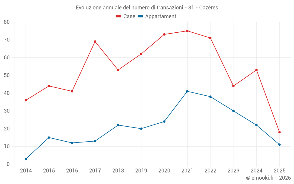 Il prezzo mediano sulle 24 transazioni di appartamenti degli ultimi 12 mesi nel comune di Cazères era di 1 626 € al metro quadrato per un valore patrimoniale mediano di 92 100 €. In questo periodo il 60% delle transazioni era tra 1 088 e 1 962 € al metro quadrato (dal 2° all'8° decile).