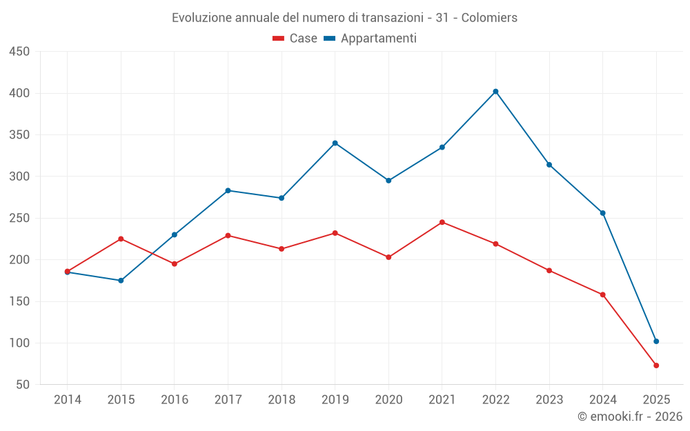 Il prezzo mediano sulle 21 transazioni di case degli ultimi 3 mesi nel comune di Colomiers era di 3 256 € al metro quadrato per un valore patrimoniale mediano di 329 000 €. In questo periodo il 60% delle transazioni era tra 2 447 e 3 558 € al metro quadrato (dal 2° all'8° decile).