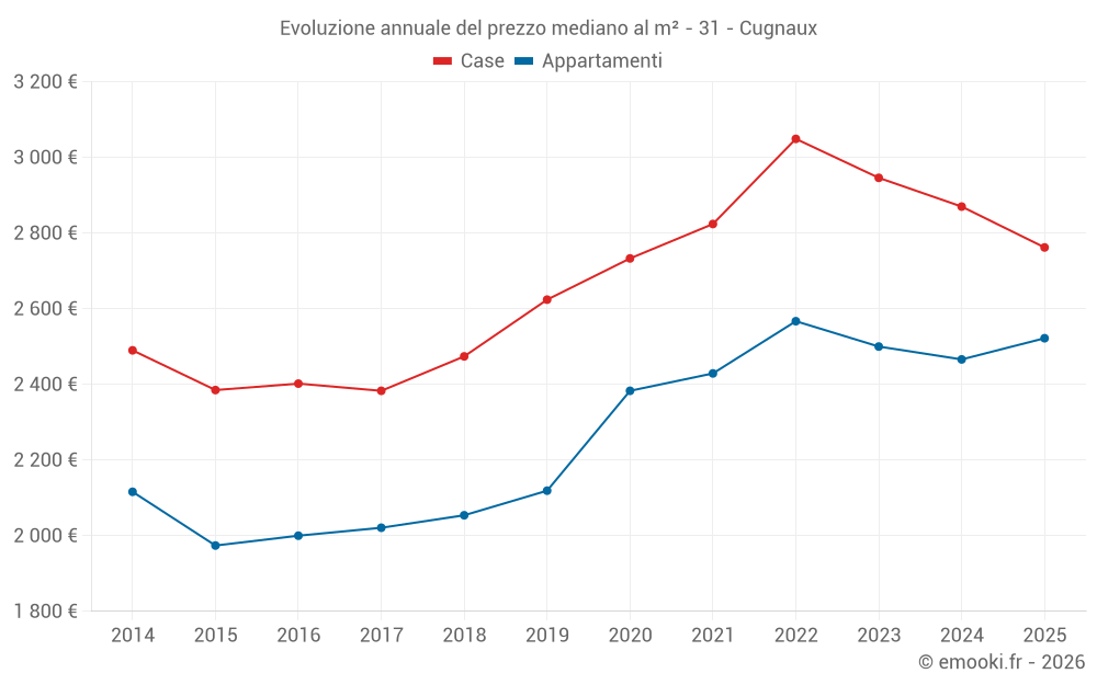 Il prezzo mediano sulle 47 transazioni di case degli ultimi 6 mesi nel comune di Cugnaux era di 2 762 € al metro quadrato per un valore patrimoniale mediano di 264 400 €. In questo periodo il 60% delle transazioni era tra 2 452 e 3 265 € al metro quadrato (dal 2° all'8° decile).