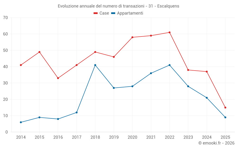 Il prezzo mediano sulle 42 transazioni di case degli ultimi 12 mesi nel comune di Escalquens era di 3 184 € al metro quadrato per un valore patrimoniale mediano di 328 525 €. In questo periodo il 60% delle transazioni era tra 2 746 e 3 786 € al metro quadrato (dal 2° all'8° decile).