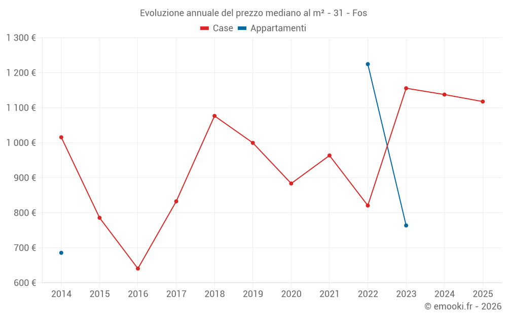 Il prezzo mediano sulle 21 transazioni di case degli ultimi 24 mesi nel comune di Fos era di 1 138 € al metro quadrato per un valore patrimoniale mediano di 95 000 €. In questo periodo il 60% delle transazioni era tra 745 e 2 100 € al metro quadrato (dal 2° all'8° decile).