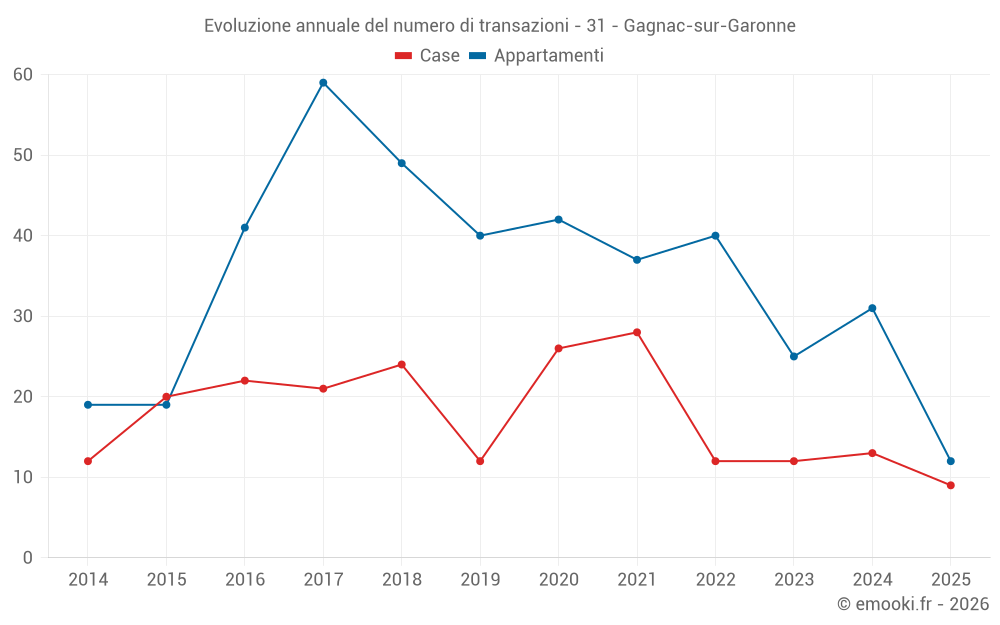 Il prezzo mediano sulle 26 transazioni di appartamenti degli ultimi 12 mesi nel comune di Gagnac-sur-Garonne era di 2 417 € al metro quadrato per un valore patrimoniale mediano di 137 775 €. In questo periodo il 60% delle transazioni era tra 2 222 e 2 698 € al metro quadrato (dal 2° all'8° decile).