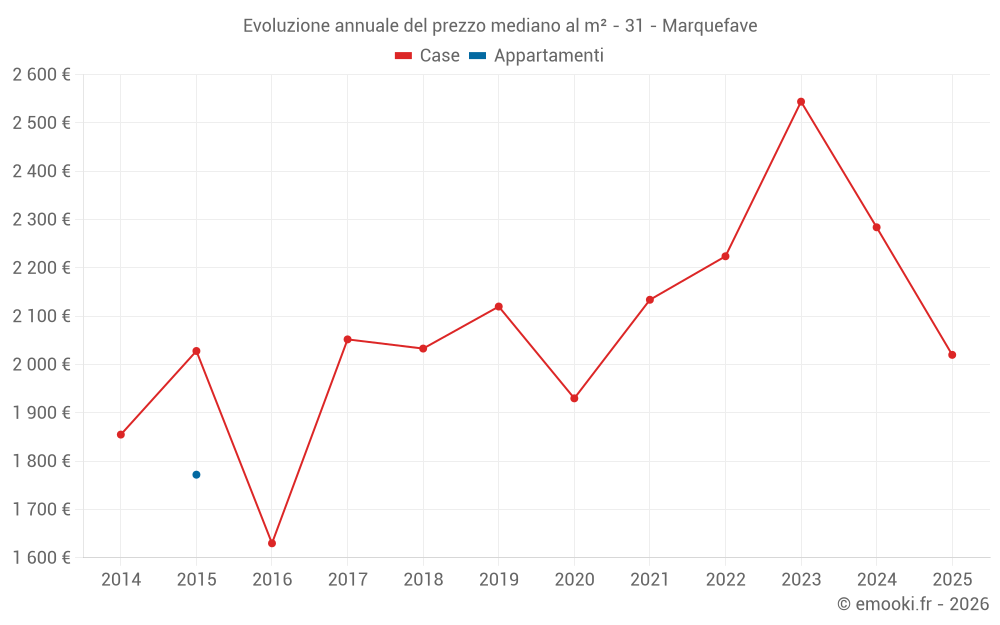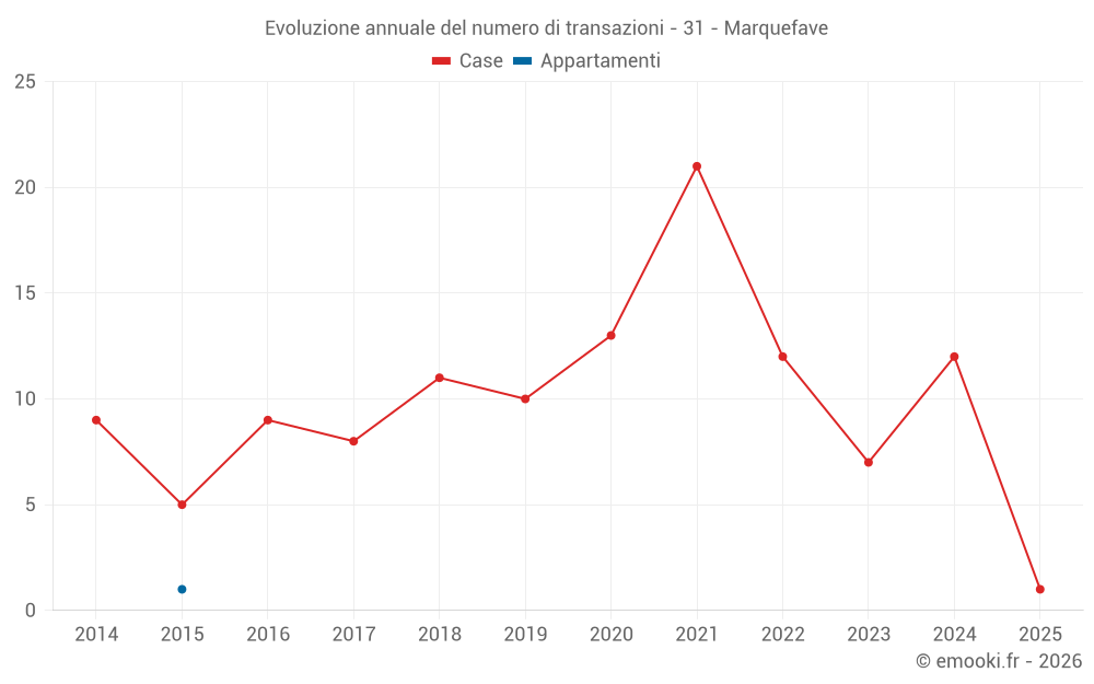 Il prezzo mediano sulle 17 transazioni di case degli ultimi 24 mesi nel comune di Marquefave era di 2 311 € al metro quadrato per un valore patrimoniale mediano di 258 000 €. In questo periodo il 60% delle transazioni era tra 2 029 e 2 590 € al metro quadrato (dal 2° all'8° decile).