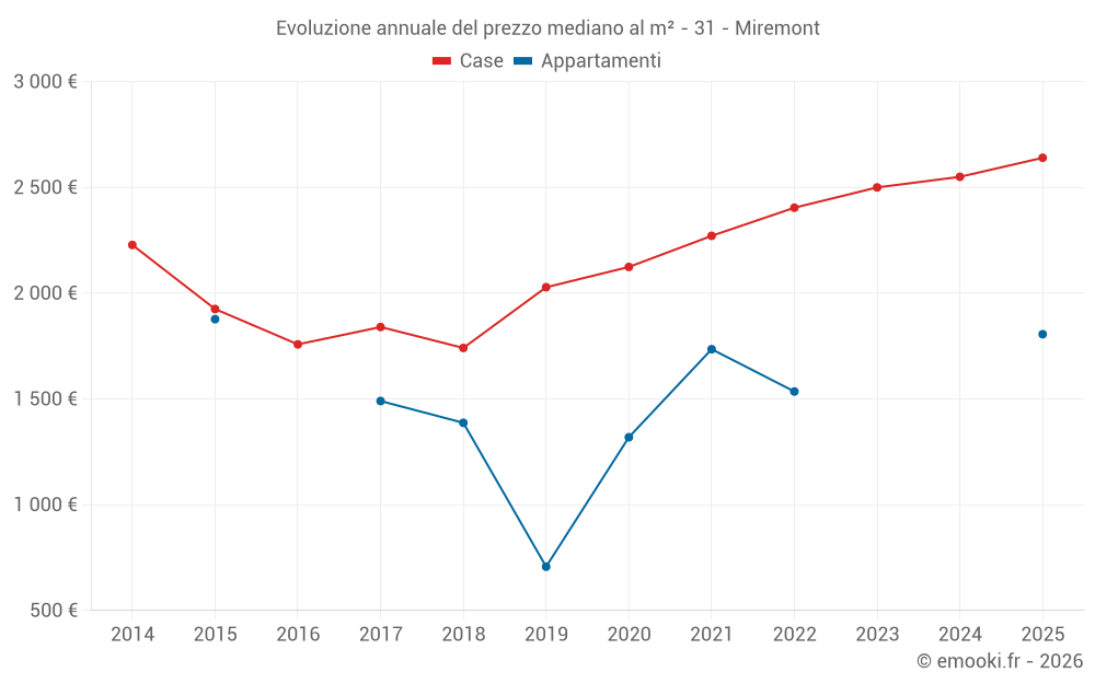 Il prezzo mediano sulle 22 transazioni di case degli ultimi 12 mesi nel comune di Miremont era di 2 624 € al metro quadrato per un valore patrimoniale mediano di 231 500 €. In questo periodo il 60% delle transazioni era tra 1 815 e 3 037 € al metro quadrato (dal 2° all'8° decile).