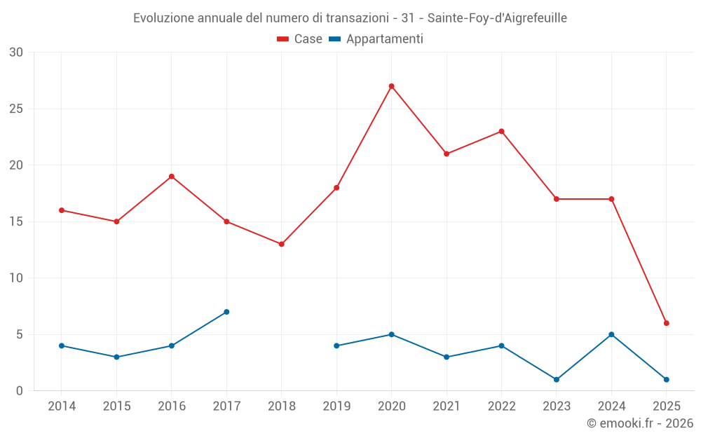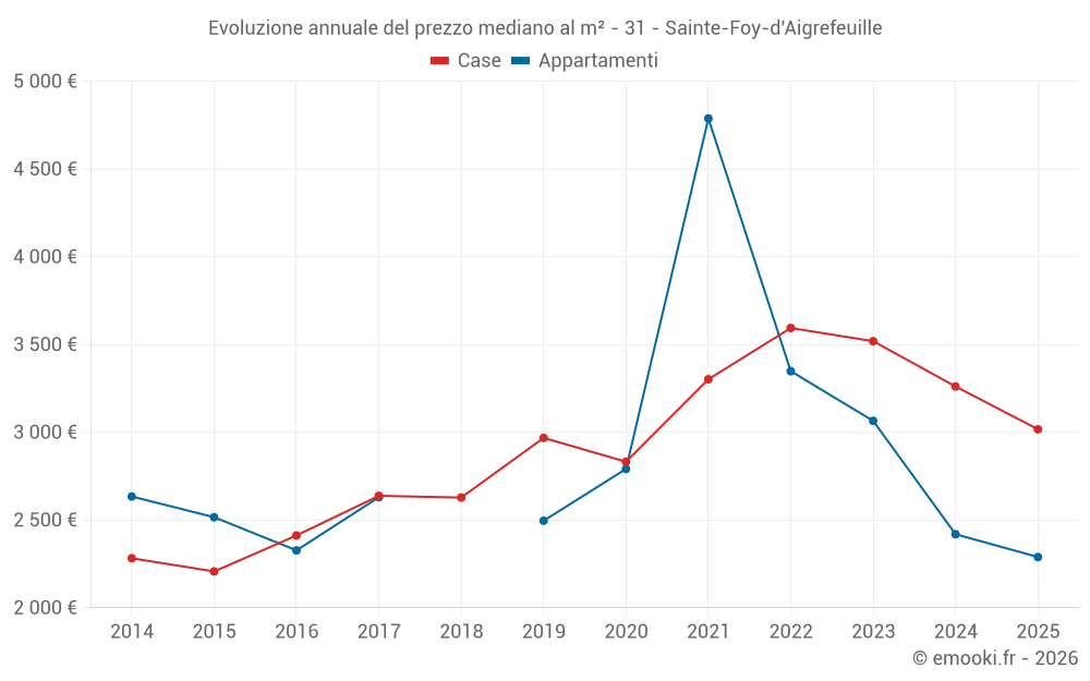 Il prezzo mediano sulle 17 transazioni di case degli ultimi 12 mesi nel comune di Sainte-Foy-d'Aigrefeuille era di 3 025 € al metro quadrato per un valore patrimoniale mediano di 394 950 €. In questo periodo il 60% delle transazioni era tra 2 889 e 3 731 € al metro quadrato (dal 2° all'8° decile).