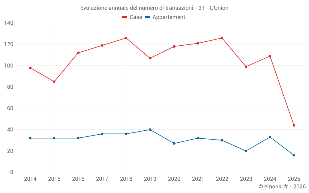 Il prezzo mediano sulle 44 transazioni di case degli ultimi 6 mesi nel comune di L'Union era di 2 940 € al metro quadrato per un valore patrimoniale mediano di 322 500 €. In questo periodo il 60% delle transazioni era tra 2 495 e 3 680 € al metro quadrato (dal 2° all'8° decile).