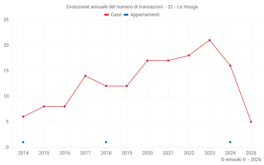 Il prezzo mediano sulle 34 transazioni di case degli ultimi 24 mesi nel comune di Le Houga era di 1 326 € al metro quadrato per un valore patrimoniale mediano di 139 000 €. In questo periodo il 60% delle transazioni era tra 990 e 1 664 € al metro quadrato (dal 2° all'8° decile).