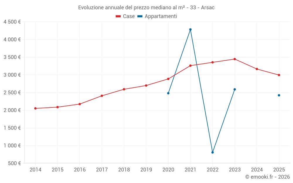 Il prezzo mediano sulle 41 transazioni di case degli ultimi 12 mesi nel comune di Arsac era di 3 125 € al metro quadrato per un valore patrimoniale mediano di 330 000 €. In questo periodo il 60% delle transazioni era tra 2 620 e 3 681 € al metro quadrato (dal 2° all'8° decile).