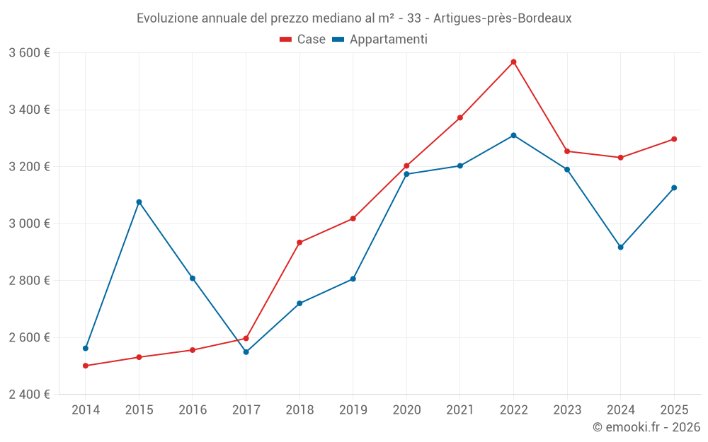 Il prezzo mediano sulle 37 transazioni di appartamenti degli ultimi 12 mesi nel comune di Artigues-près-Bordeaux era di 2 989 € al metro quadrato per un valore patrimoniale mediano di 165 000 €. In questo periodo il 60% delle transazioni era tra 2 826 e 3 246 € al metro quadrato (dal 2° all'8° decile).