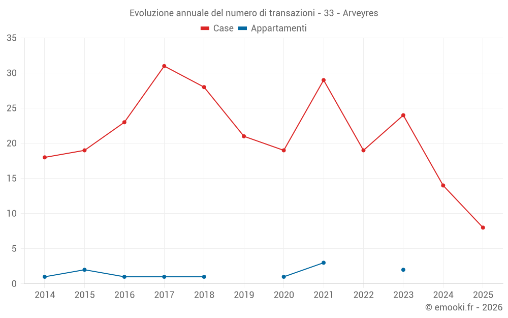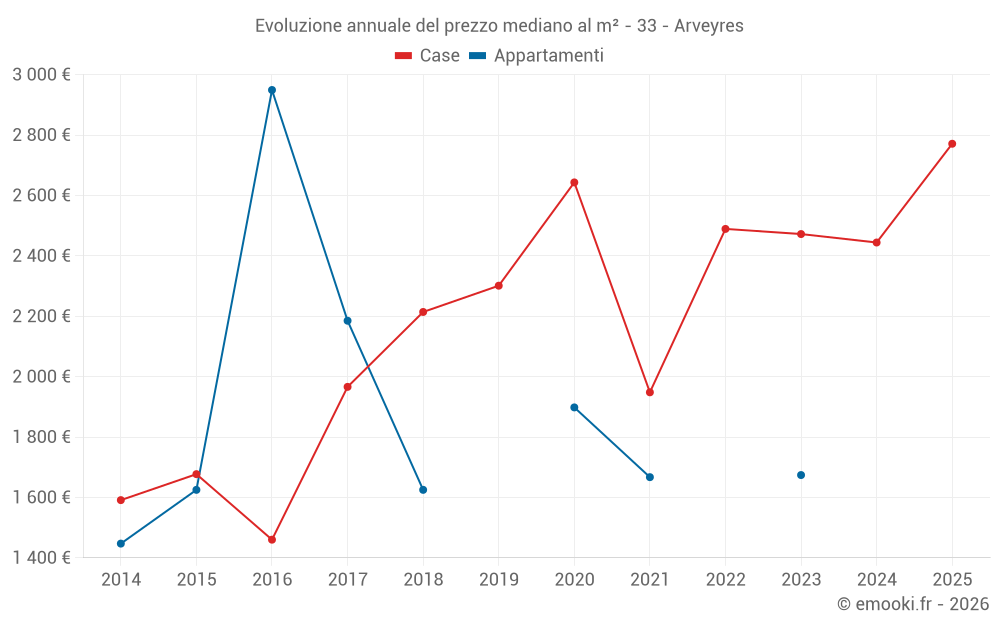 Il prezzo mediano sulle 16 transazioni di case degli ultimi 12 mesi nel comune di Arveyres era di 2 614 € al metro quadrato per un valore patrimoniale mediano di 238 840 €. In questo periodo il 60% delle transazioni era tra 1 765 e 2 988 € al metro quadrato (dal 2° all'8° decile).