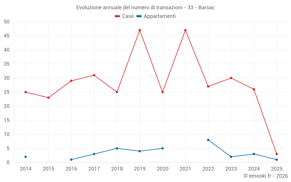 Il prezzo mediano sulle 21 transazioni di case degli ultimi 12 mesi nel comune di Barsac era di 1 813 € al metro quadrato per un valore patrimoniale mediano di 167 000 €. In questo periodo il 60% delle transazioni era tra 1 070 e 2 667 € al metro quadrato (dal 2° all'8° decile).