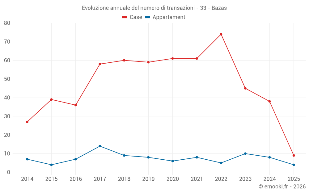 Il prezzo mediano sulle 29 transazioni di case degli ultimi 12 mesi nel comune di Bazas era di 2 018 € al metro quadrato per un valore patrimoniale mediano di 178 250 €. In questo periodo il 60% delle transazioni era tra 1 324 e 2 544 € al metro quadrato (dal 2° all'8° decile).