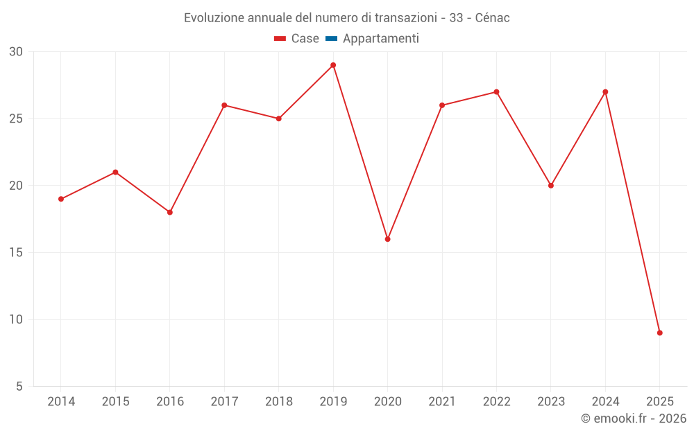 Il prezzo mediano sulle 24 transazioni di case degli ultimi 12 mesi nel comune di Cénac era di 2 842 € al metro quadrato per un valore patrimoniale mediano di 250 000 €. In questo periodo il 60% delle transazioni era tra 2 359 e 3 413 € al metro quadrato (dal 2° all'8° decile).
