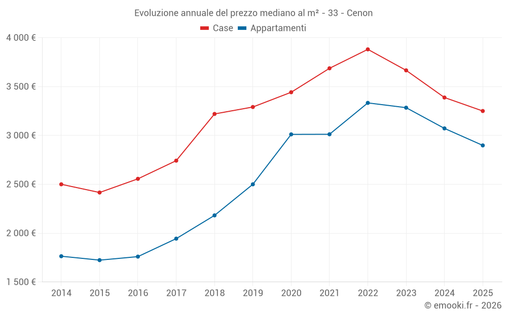Il prezzo mediano sulle 22 transazioni di case degli ultimi 3 mesi nel comune di Cenon era di 2 948 € al metro quadrato per un valore patrimoniale mediano di 267 500 €. In questo periodo il 60% delle transazioni era tra 2 645 e 3 812 € al metro quadrato (dal 2° all'8° decile).