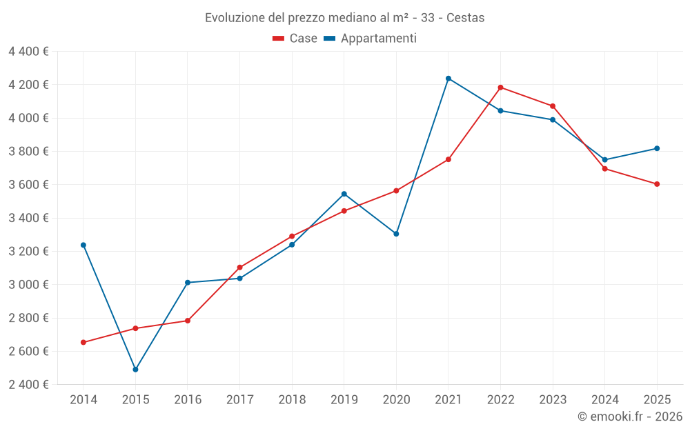Il prezzo mediano sulle 38 transazioni di case degli ultimi 6 mesi nel comune di Cestas era di 3 604 € al metro quadrato per un valore patrimoniale mediano di 344 590 €. In questo periodo il 60% delle transazioni era tra 2 679 e 4 136 € al metro quadrato (dal 2° all'8° decile).