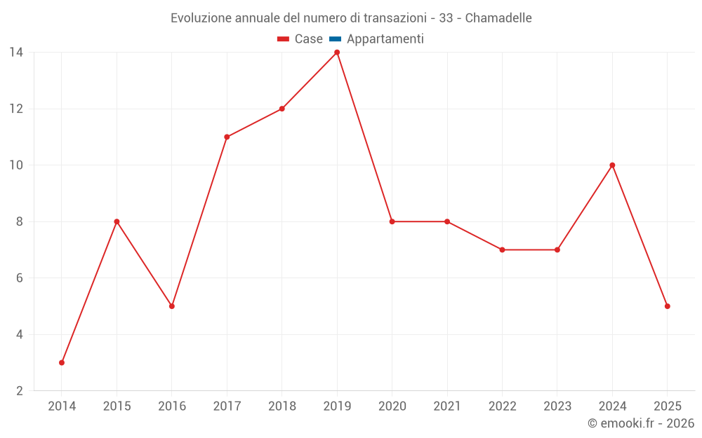 Il prezzo mediano sulle 17 transazioni di case degli ultimi 24 mesi nel comune di Chamadelle era di 1 303 € al metro quadrato per un valore patrimoniale mediano di 135 000 €. In questo periodo il 60% delle transazioni era tra 969 e 2 054 € al metro quadrato (dal 2° all'8° decile).