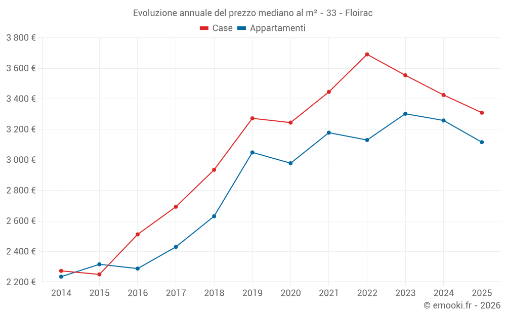 Il prezzo mediano sulle 32 transazioni di case degli ultimi 6 mesi nel comune di Floirac era di 3 309 € al metro quadrato per un valore patrimoniale mediano di 274 850 €. In questo periodo il 60% delle transazioni era tra 2 929 e 3 739 € al metro quadrato (dal 2° all'8° decile).