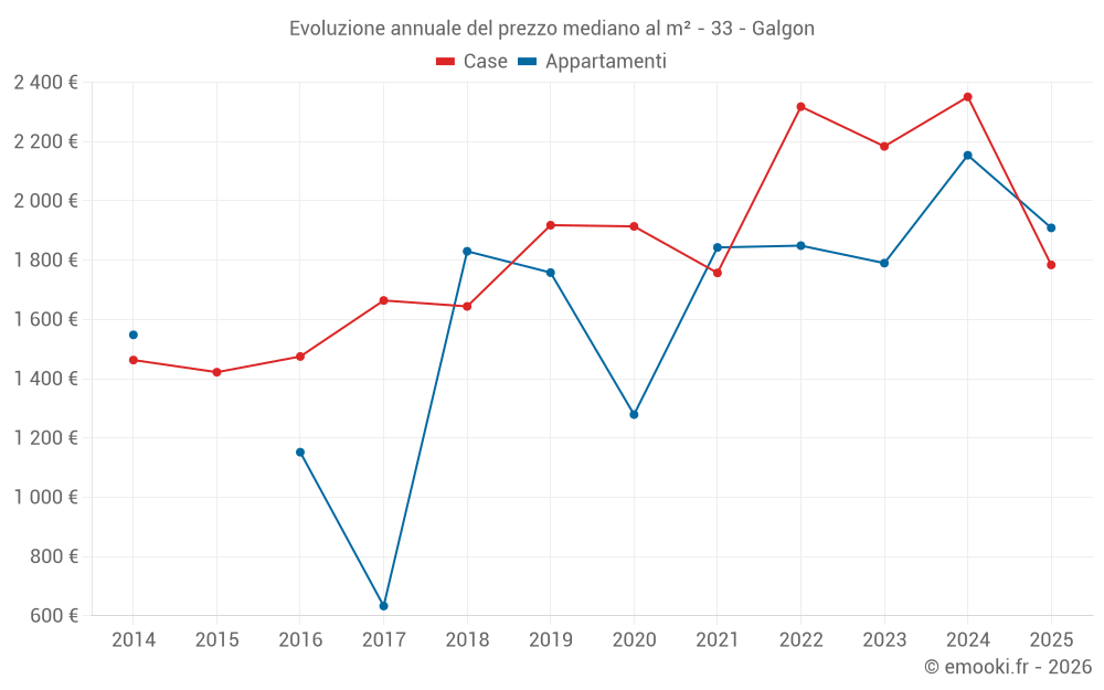 Il prezzo mediano sulle 23 transazioni di case degli ultimi 12 mesi nel comune di Galgon era di 2 478 € al metro quadrato per un valore patrimoniale mediano di 235 000 €. In questo periodo il 60% delle transazioni era tra 1 773 e 2 788 € al metro quadrato (dal 2° all'8° decile).