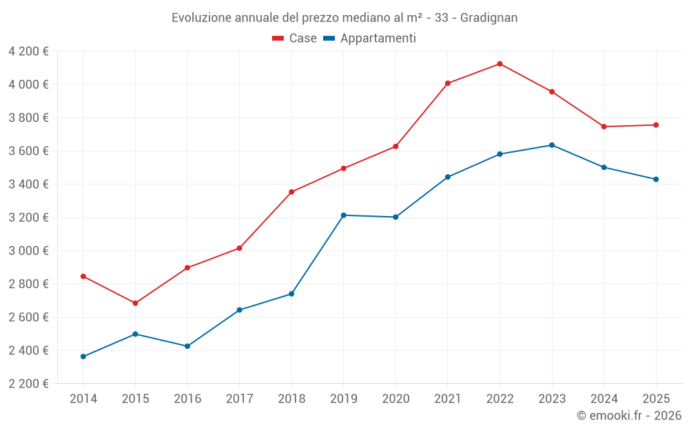 Il prezzo mediano sulle 27 transazioni di case degli ultimi 3 mesi nel comune di Gradignan era di 3 814 € al metro quadrato per un valore patrimoniale mediano di 376 250 €. In questo periodo il 60% delle transazioni era tra 3 186 e 4 697 € al metro quadrato (dal 2° all'8° decile).