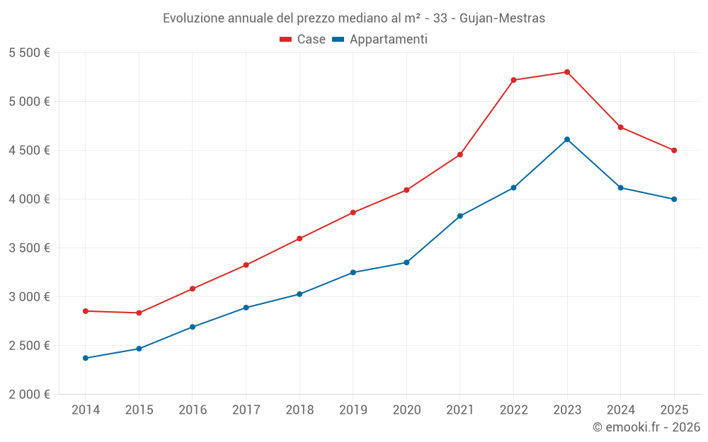 Il prezzo mediano sulle 46 transazioni di case degli ultimi 3 mesi nel comune di Gujan-Mestras era di 4 162 € al metro quadrato per un valore patrimoniale mediano di 400 000 €. In questo periodo il 60% delle transazioni era tra 3 460 e 5 727 € al metro quadrato (dal 2° all'8° decile).