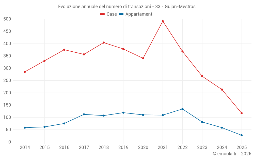 Il prezzo mediano sulle 27 transazioni di appartamenti degli ultimi 6 mesi nel comune di Gujan-Mestras era di 4 000 € al metro quadrato per un valore patrimoniale mediano di 195 000 €. In questo periodo il 60% delle transazioni era tra 3 419 e 4 625 € al metro quadrato (dal 2° all'8° decile).