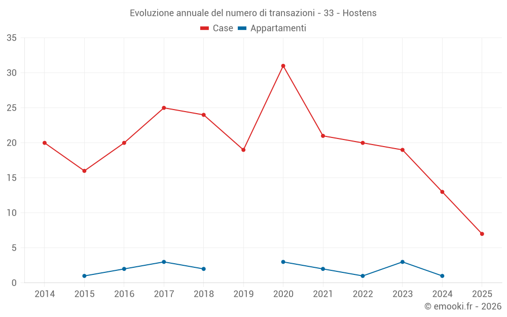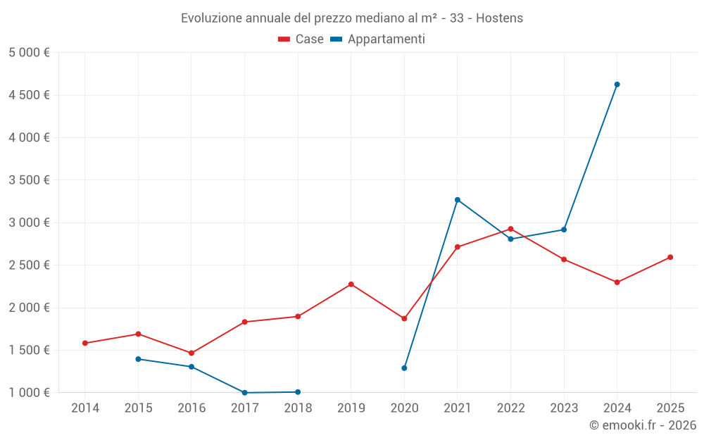 Il prezzo mediano sulle 30 transazioni di case degli ultimi 24 mesi nel comune di Hostens era di 2 474 € al metro quadrato per un valore patrimoniale mediano di 245 875 €. In questo periodo il 60% delle transazioni era tra 1 738 e 2 870 € al metro quadrato (dal 2° all'8° decile).