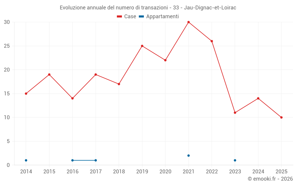 Il prezzo mediano sulle 17 transazioni di case degli ultimi 12 mesi nel comune di Jau-Dignac-et-Loirac era di 1 917 € al metro quadrato per un valore patrimoniale mediano di 162 000 €. In questo periodo il 60% delle transazioni era tra 943 e 2 630 € al metro quadrato (dal 2° all'8° decile).