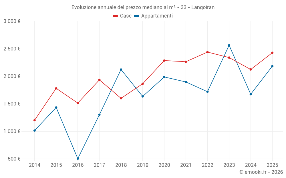 Il prezzo mediano sulle 20 transazioni di case degli ultimi 12 mesi nel comune di Langoiran era di 2 150 € al metro quadrato per un valore patrimoniale mediano di 233 650 €. In questo periodo il 60% delle transazioni era tra 1 673 e 3 009 € al metro quadrato (dal 2° all'8° decile).