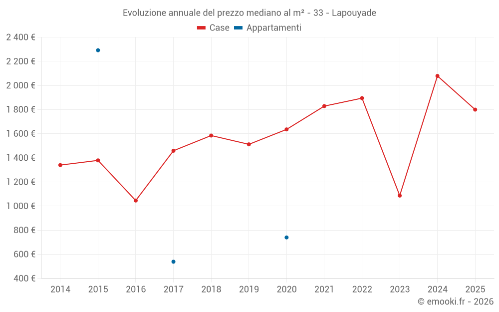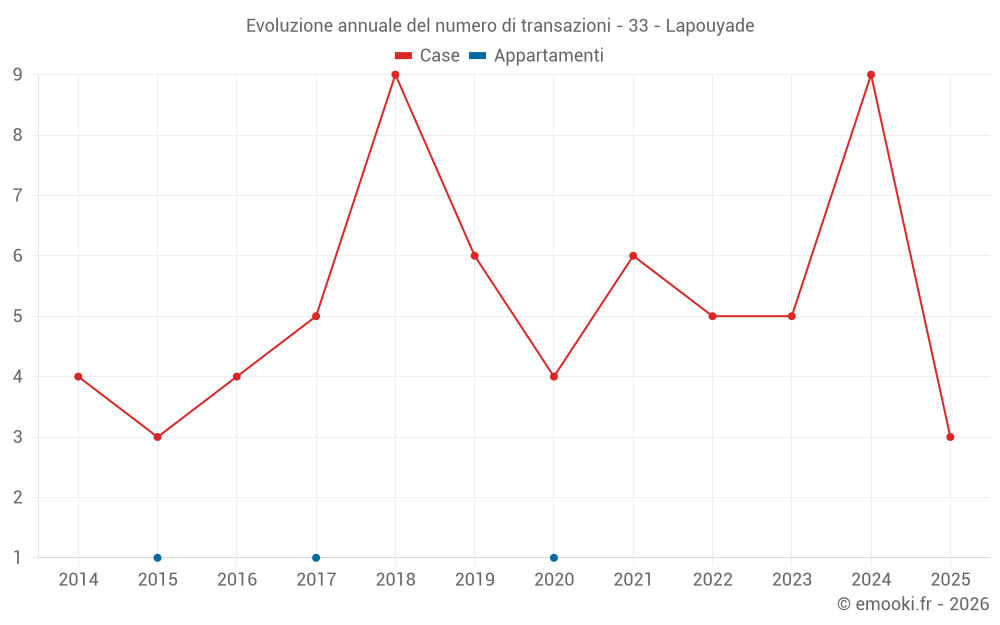 Il prezzo mediano sulle 14 transazioni di case degli ultimi 24 mesi nel comune di Lapouyade era di 1 898 € al metro quadrato per un valore patrimoniale mediano di 200 012 €. In questo periodo il 60% delle transazioni era tra 1 437 e 2 170 € al metro quadrato (dal 2° all'8° decile).