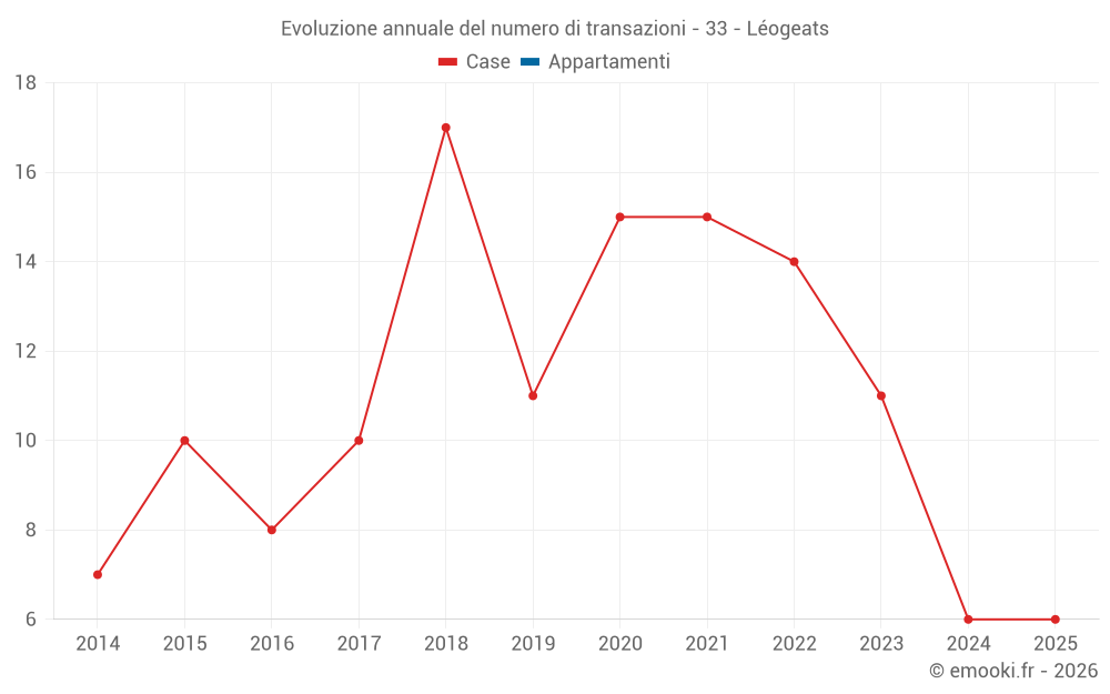 Il prezzo mediano sulle 17 transazioni di case degli ultimi 24 mesi nel comune di Léogeats era di 1 947 € al metro quadrato per un valore patrimoniale mediano di 192 150 €. In questo periodo il 60% delle transazioni era tra 1 232 e 2 476 € al metro quadrato (dal 2° all'8° decile).