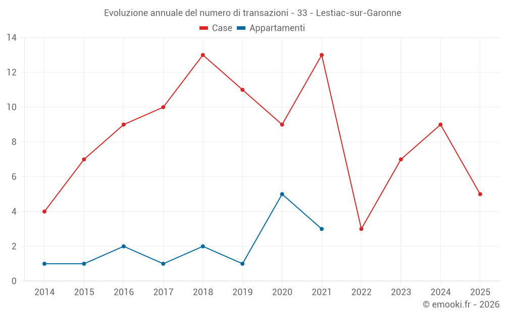 Il prezzo mediano sulle 16 transazioni di case degli ultimi 24 mesi nel comune di Lestiac-sur-Garonne era di 2 116 € al metro quadrato per un valore patrimoniale mediano di 162 750 €. In questo periodo il 60% delle transazioni era tra 1 743 e 2 804 € al metro quadrato (dal 2° all'8° decile).