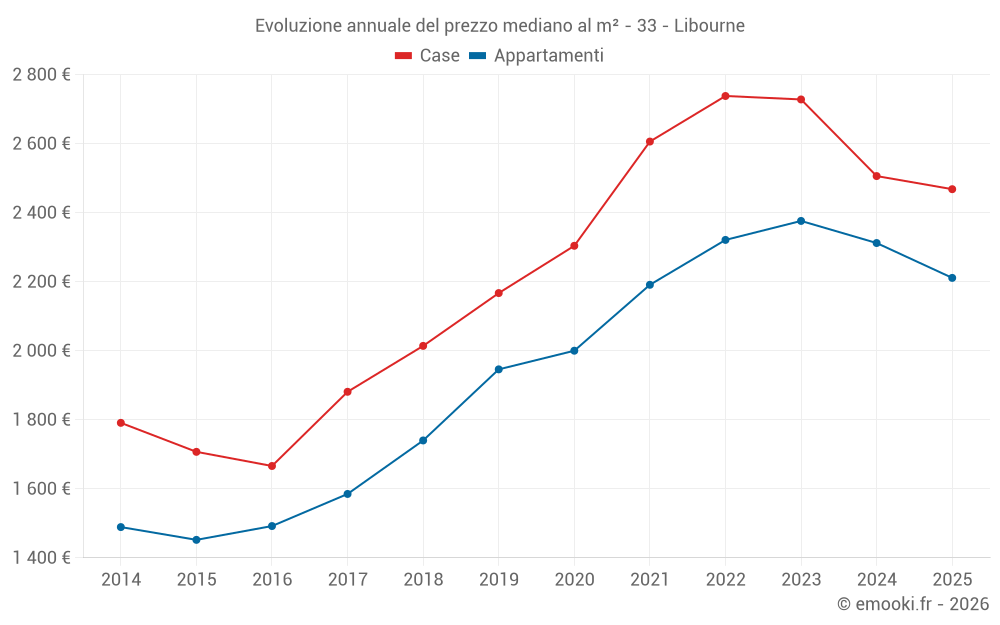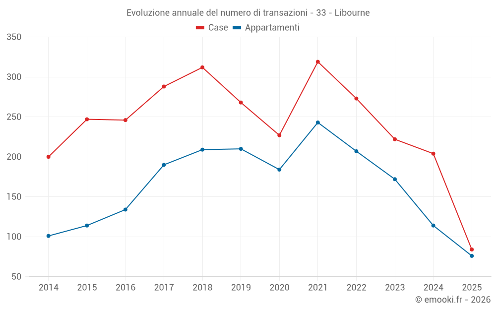 Il prezzo mediano sulle 35 transazioni di appartamenti degli ultimi 3 mesi nel comune di Libourne era di 2 222 € al metro quadrato per un valore patrimoniale mediano di 130 400 €. In questo periodo il 60% delle transazioni era tra 1 753 e 2 703 € al metro quadrato (dal 2° all'8° decile).