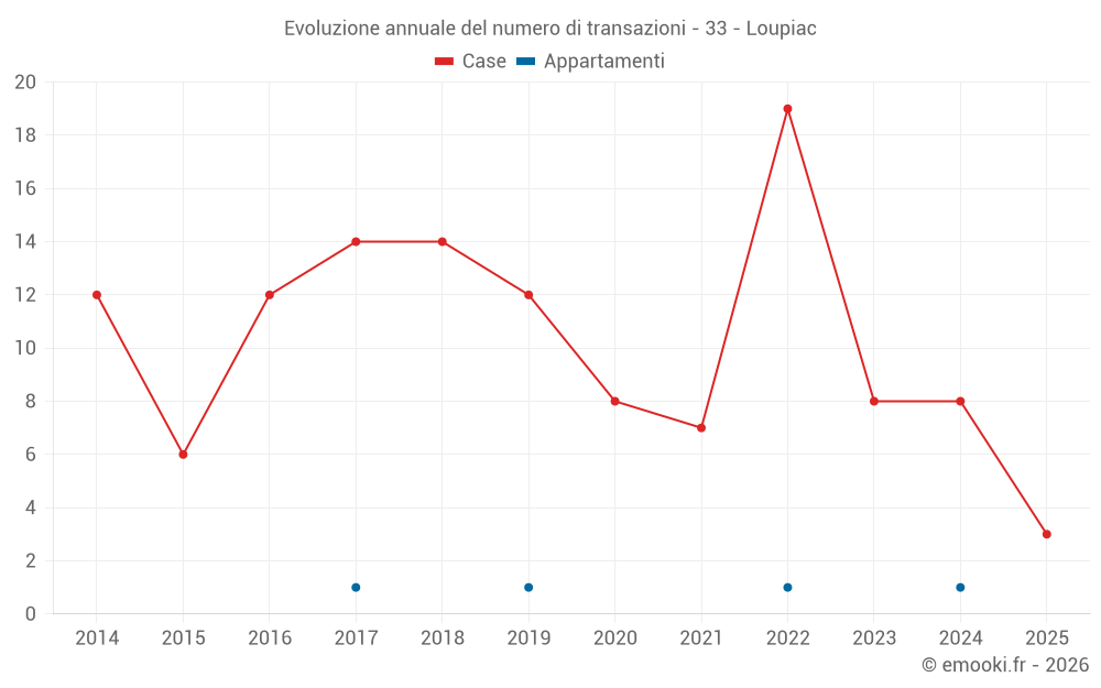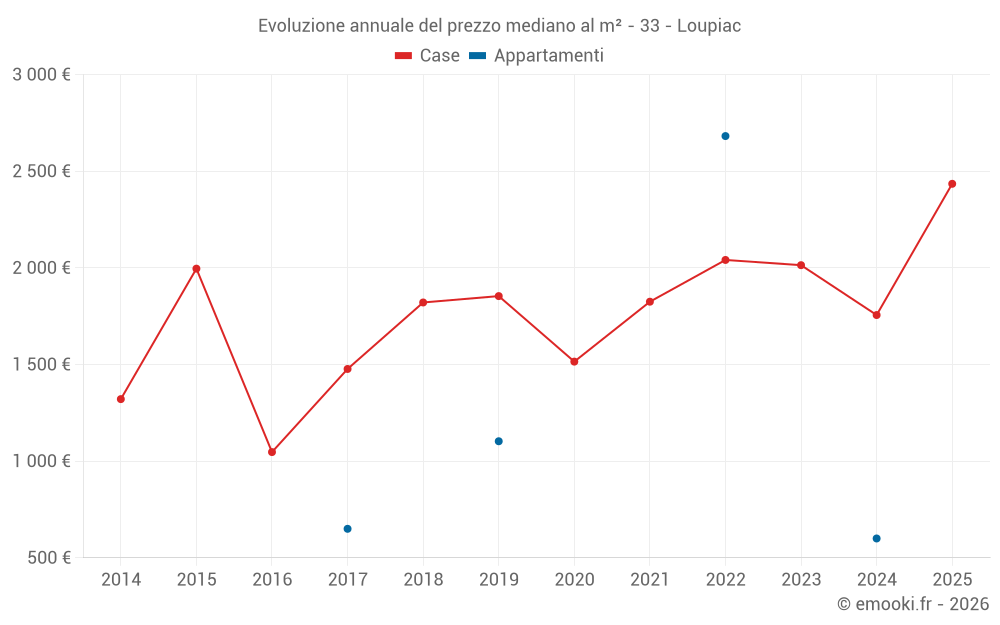 Il prezzo mediano sulle 15 transazioni di case degli ultimi 24 mesi nel comune di Loupiac era di 2 029 € al metro quadrato per un valore patrimoniale mediano di 216 700 €. In questo periodo il 60% delle transazioni era tra 1 404 e 2 616 € al metro quadrato (dal 2° all'8° decile).