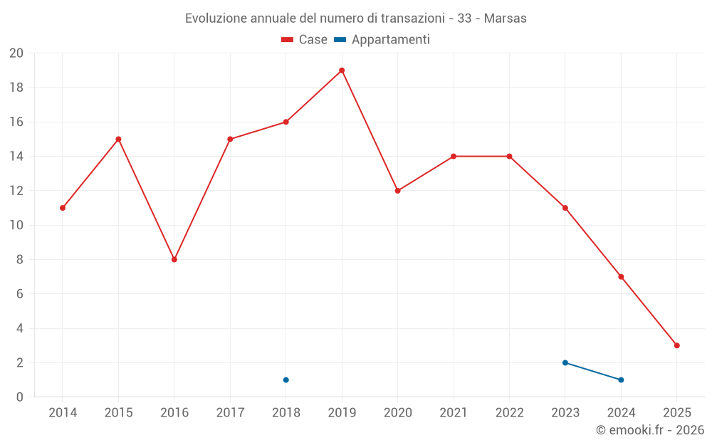 Il prezzo mediano sulle 15 transazioni di case degli ultimi 24 mesi nel comune di Marsas era di 2 190 € al metro quadrato per un valore patrimoniale mediano di 223 896 €. In questo periodo il 60% delle transazioni era tra 1 918 e 2 593 € al metro quadrato (dal 2° all'8° decile).