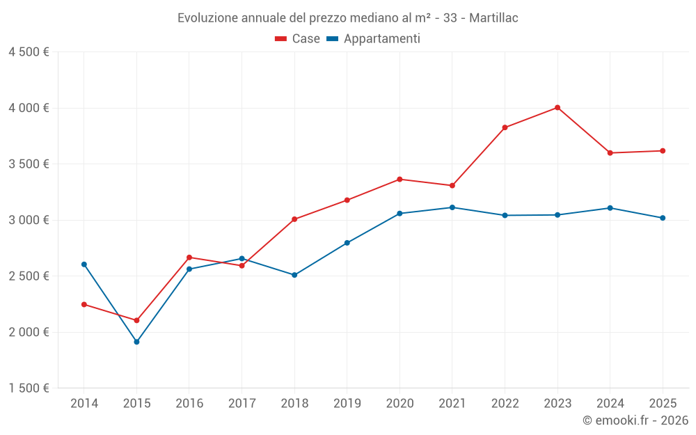 Il prezzo mediano sulle 23 transazioni di case degli ultimi 12 mesi nel comune di Martillac era di 3 605 € al metro quadrato per un valore patrimoniale mediano di 379 957 €. In questo periodo il 60% delle transazioni era tra 3 234 e 3 887 € al metro quadrato (dal 2° all'8° decile).