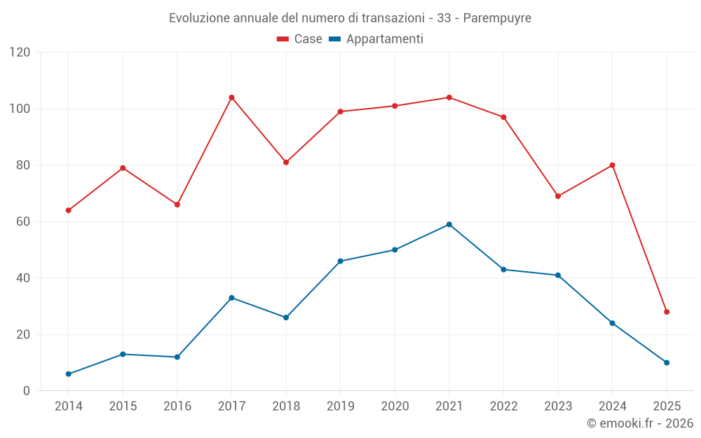 Il prezzo mediano sulle 26 transazioni di appartamenti degli ultimi 12 mesi nel comune di Parempuyre era di 3 304 € al metro quadrato per un valore patrimoniale mediano di 166 426 €. In questo periodo il 60% delle transazioni era tra 2 882 e 3 576 € al metro quadrato (dal 2° all'8° decile).