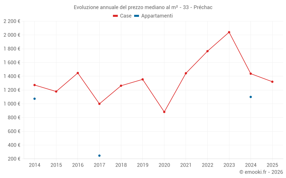 Il prezzo mediano sulle 17 transazioni di case degli ultimi 12 mesi nel comune di Préchac era di 1 321 € al metro quadrato per un valore patrimoniale mediano di 120 000 €. In questo periodo il 60% delle transazioni era tra 801 e 1 839 € al metro quadrato (dal 2° all'8° decile).
