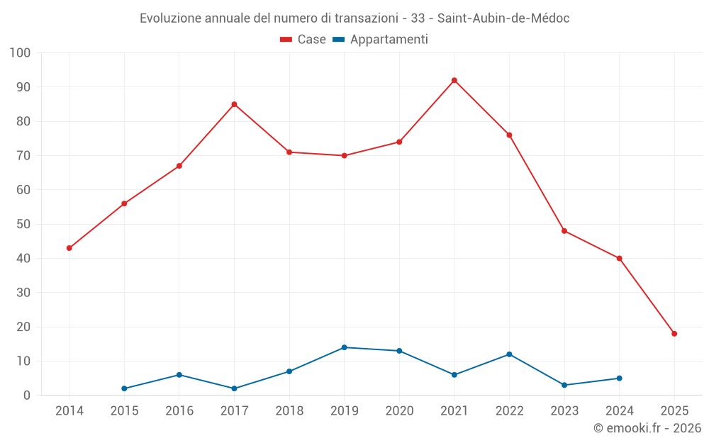Il prezzo mediano sulle 18 transazioni di case degli ultimi 6 mesi nel comune di Saint-Aubin-de-Médoc era di 3 447 € al metro quadrato per un valore patrimoniale mediano di 417 000 €. In questo periodo il 60% delle transazioni era tra 3 099 e 4 104 € al metro quadrato (dal 2° all'8° decile).
