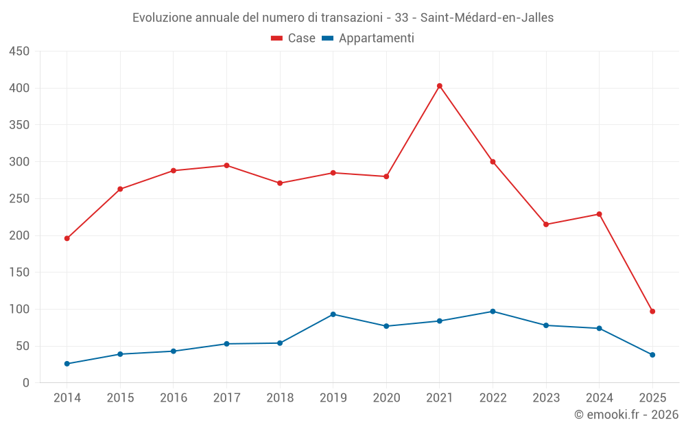Il prezzo mediano sulle 38 transazioni di appartamenti degli ultimi 6 mesi nel comune di Saint-Médard-en-Jalles era di 3 308 € al metro quadrato per un valore patrimoniale mediano di 184 500 €. In questo periodo il 60% delle transazioni era tra 3 072 e 3 907 € al metro quadrato (dal 2° all'8° decile).
