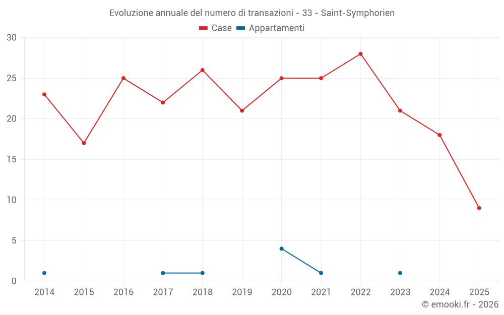 Il prezzo mediano sulle 19 transazioni di case degli ultimi 12 mesi nel comune di Saint-Symphorien era di 1 885 € al metro quadrato per un valore patrimoniale mediano di 190 000 €. In questo periodo il 60% delle transazioni era tra 1 458 e 2 964 € al metro quadrato (dal 2° all'8° decile).