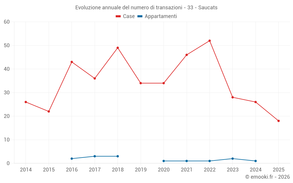 Il prezzo mediano sulle 18 transazioni di case degli ultimi 6 mesi nel comune di Saucats era di 3 398 € al metro quadrato per un valore patrimoniale mediano di 320 750 €. In questo periodo il 60% delle transazioni era tra 2 485 e 3 754 € al metro quadrato (dal 2° all'8° decile).
