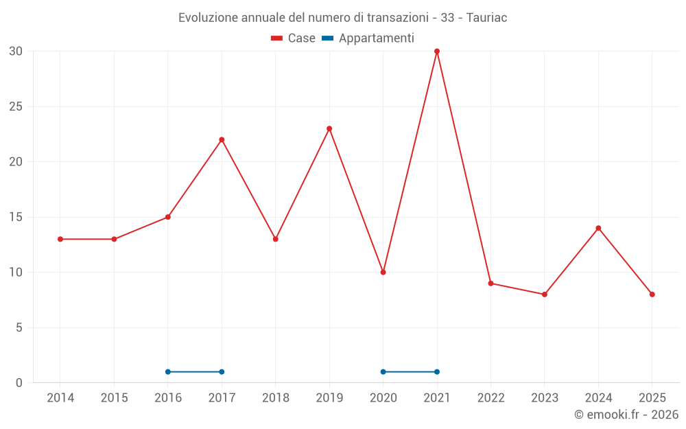 Il prezzo mediano sulle 20 transazioni di case degli ultimi 12 mesi nel comune di Tauriac era di 2 086 € al metro quadrato per un valore patrimoniale mediano di 186 000 €. In questo periodo il 60% delle transazioni era tra 1 622 e 2 393 € al metro quadrato (dal 2° all'8° decile).