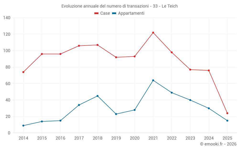 Il prezzo mediano sulle 24 transazioni di case degli ultimi 6 mesi nel comune di Le Teich era di 4 164 € al metro quadrato per un valore patrimoniale mediano di 440 875 €. In questo periodo il 60% delle transazioni era tra 3 305 e 4 692 € al metro quadrato (dal 2° all'8° decile).