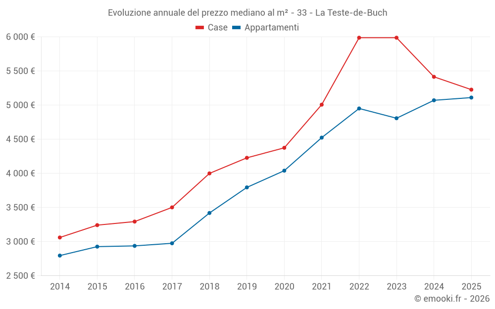 Il prezzo mediano sulle 61 transazioni di case degli ultimi 3 mesi nel comune di La Teste-de-Buch era di 5 211 € al metro quadrato per un valore patrimoniale mediano di 505 990 €. In questo periodo il 60% delle transazioni era tra 4 091 e 7 454 € al metro quadrato (dal 2° all'8° decile).