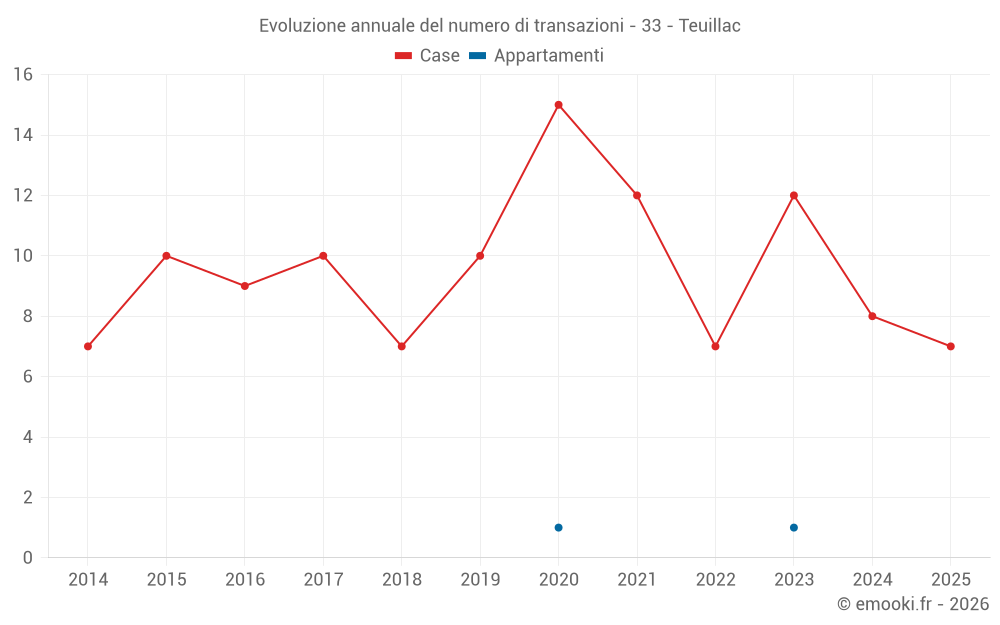 Il prezzo mediano sulle 19 transazioni di case degli ultimi 24 mesi nel comune di Teuillac era di 2 179 € al metro quadrato per un valore patrimoniale mediano di 216 170 €. In questo periodo il 60% delle transazioni era tra 1 484 e 2 558 € al metro quadrato (dal 2° all'8° decile).